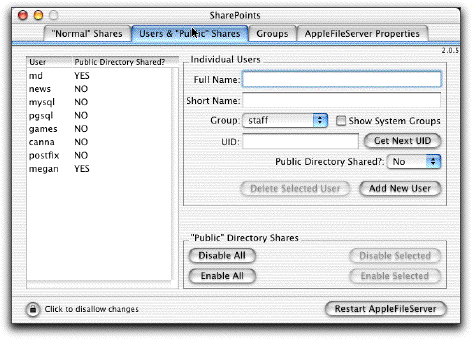 In addition SharePoints also brings back users and groups management to Mac OS X as well as easy configuration of AppleFileServer (AFS) and Samba (SMB) Server properties.
