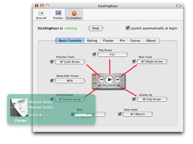 SizzlingKeys (direct link) is a freeware preference pane that adds hotkey control to iTunes, as well as a neat little floater upon track changes (sadly, the floater cannot show cover art from shared iTunes libraries, even though iTunes has access to it).