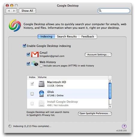 Google Desktop for Mac allows you to search Gmail, web history, the web, past file revisions and deleted files (something that Spotlight doesn't do), and also does fast application launching a la Quicksilver.